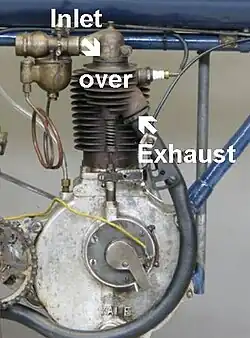 - ↑ a b Wilson, Hugo (1993). «Glossary». The Ultimate Motorcycle Book. Photography by Dave King. London: Dorling Kindersley. p. 188. ISBN 0-7513-0043-8. «IOE Inlet over exhaust. Valve layout in which the inlet valve is placed directly over the (side) exhaust valve. Common on early engines, a development of atmospheric valve engines.»