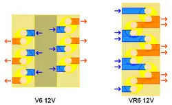 El VR6 fue específicamente diseñado para motores instalados transversalemente en coches con tracción delantera. Usando un ángulo estrecho de 15° entre las bancadas en un VR6, es posible instalar un motor de seis cilindros en el vano motor de cuatro cilindros de los coches existentes de Volkswagen. Un motor V6 convencional puede requerir alargar los vehículos para dar lugar al nuevo motor, más ancho. El VR6 puede utilizar el orden de encendido de un motor de seis cilindros en línea, dando como resultado, un funcionamiento igual de suave.[1]