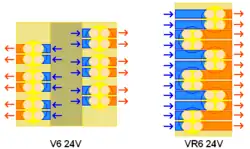 El ángulo angosto entre los cilindros permite usar solamente una bancada de cilindros y una culata, mientras que en los motores en V convencionales requieren dos bancadas de cilindros y dos culatas separadas. Usar solamente una culata de cilindros, permite utilizar dos árboles de levas, en lugar de cuatro a la cabeza (DOHC) para comandar todas las válvulas. Esto simplifica la construcción del motor y reduce los costos. En los primeros VR6 de 12 válvulas había dos árboles de levas a la cabeza con seis levas cada uno. El árbol de levas delantero tenía tres levas de admisión y tres de escape para controlar los tres cilindros delanteros. El árbol de levas trasero estaba diseñado de la misma manera, pero controlaba los tres cilindros restantes. El principio de operación es similar al diseño de un árbol de levas a la cabeza (SOHC). Los VR6 posteriores de 24 válvulas, mantienen el doble árbol de levas a la cabeza, pero con 12 levas cada uno. Sin embargo, la operación de los árboles de levas en los motores de 24 válvulas, difiere a la de los primeros motores con 12 válvulas, un árbol opera solamente las válvulas de escape y el otro las de admisión. Este principio es más parecido al del diseño de doble árbol de levas a la cabeza.[2]