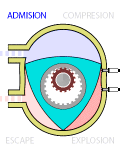 El rotor sigue un recorrido en el que mantiene sus 3 vértices en contacto con el "estator" o "epitrocoide", delimitando así tres compartimentos separados de mezcla. A medida que el rotor gira dentro de la cámara, cada uno de los 3 volúmenes se expande y contrae alternativamente; es esta expansión-contracción la que aspira el aire y el combustible hacia el motor, comprime la mezcla, extrae su energía expansiva y luego expulsa los gases quemados hacia el escape. [2]