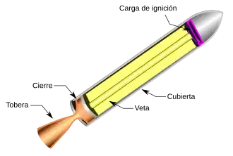 Un motor de un cohete de combustible sólido simple consta de una cubierta, una tobera, la veta (carga propulsora), y un material para la ignición.