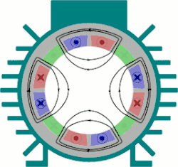 El desplazamiento real del máximo de intensidad del campo magnético desde un polo al siguiente, atrae al rotor de jaula de ardilla con sus corrientes y campos inducidos, haciéndole girar. Esto hace que el motor se arranque por sí mismo.