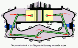 Los motores de camión Commer TS3 de 3 cilindros (diseñados originalmente por Tilling-Stevens) tienen un solo cigüeñal debajo del centro de los cilindros, con ambos pistones conectados por palancas.[11] Este tipo de configuración data al menos de 1914, cuando apareció el motor de gasolina denominado "Simpson de dos tiempos", según se publicó aquel año en la revista "The Motor Cycle".[12] Este diseño se valía de la compresión en el cárter y utilizaba un pistón para abrir el puerto de alimentación y otro para abrir el orificio de escape, lo que permitía que la carga de aire fresco fluyese desde un extremo del cilindro al otro, evitando así la necesidad de corona deflectora para los pistones utilizados en la mayoría de los motores de dos tiempos de la época. Las bielas que operan los pistones permitían un gran desplazamiento del pistón con una manivela más pequeña.