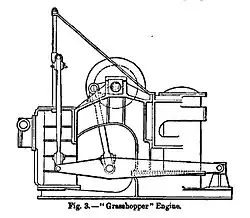El saltamontes o motor de 'media leva'[10] era una variante del motor de leva lateral. Se diferencia de la palanca lateral convencional en que la ubicación del pivote de la palanca y la biela estaban más o menos invertidas, con el pivote ubicado en un extremo de la palanca en lugar del centro, mientras que la biela está unida a la palanca entre el cilindro en un extremo y el pivote en el otro.[11]