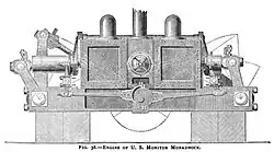 Ericsson resolvió este problema colocando dos cilindros horizontales consecutivos en el medio del motor, trabajando sobre dos "palancas vibratorias", una a cada lado, que por medio de ejes y palancas adicionales hacían girar un cigüeñal también ubicado en el centro.[32] Los motores de palanca vibratoria se usaron más tarde en algunos otros buques de guerra y buques mercantes, pero su uso se limitó a los barcos construidos en los Estados Unidos y en el país natal de Ericsson, Suecia,[33] y pronto tuvieron pocas ventajas sobre los motores más convencionales, siendo suplantados por otros tipos.