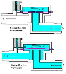 Una válvula de solenoide se basa en el desplazamiento de un núcleo de material ferromagnético dispuesto en el eje de un solenoide cuando circula por la bobina una corriente eléctrica. Un actuador de solenoide puede ser de simple acción (actuando contra un muelle mecánico) o de doble acción (con dos solenoides de efecto contrario).
