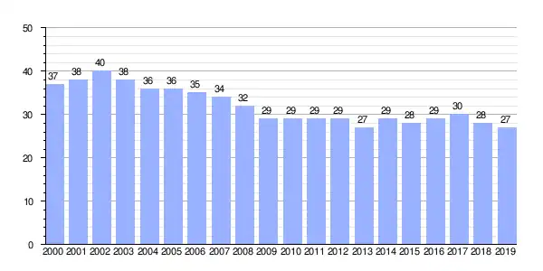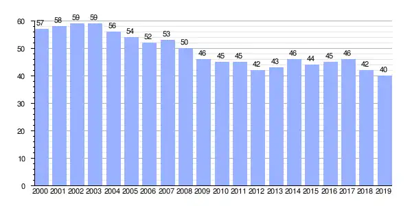 | Gráfica de evolución demográfica de Mourazos (lugar) entre 2000 y 2019 |