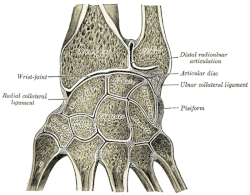 Las superficies óseas son, por arriba, el radio y un disco articular que se encuentra entre el cúbito y el carpo, y por abajo, el escafoides, el semilunar y el piramidal. La articulación está reforzada por la «cápsula articular» y ligamentos laterales, anterior y posterior. Es una condílea morfológica y funcional.