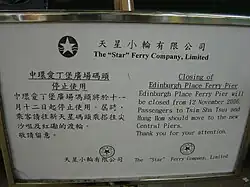 - ↑ a b Kwoh, Leslie (15 de noviembre de 2006). «Early demolition for old Star Ferry pier». The Standard (en inglés). Hong Kong: The Standard Newspaper Publishing. Archivado desde el original el 22 de mayo de 2011.