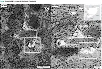 ![]() Vista satelital del complejo de Al-Baghdadi antes y después de la operación. | ||||