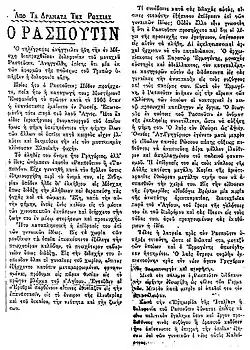 Fragmento del periódico griego Empros anunciando la muerte de Rasputín.