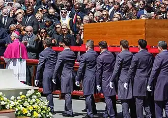 El 22 de abril de 2025 la oficina de celebraciones litúrgicas anunció los detalles sobre el traslado del cuerpo del papa a la basílica de San Pedro,[42]​ de su funeral y de su entierro.[43]​ El traslado del cuerpo del papa tuvo lugar el 23 de abril de 2025 a las 09:00 horas (UTC+02:00) en una procesión encabezada por el camarlengo de la Iglesia católica Kevin Farrell la cuál contó con la presencia de más de 20,000 personas, que salió desde la capilla de la Domus Sanctae Marthae y se dirigió a la basílica de san pedro,[44][45]​ siendo puesto el cuerpo ante el altar de la confesión de la mencionada basílica[44]​ en donde permaneció a la vista del público hasta el 25 de abril de 2025 siendo visto por cerca de 250,000 personas de forma continuada.[46]​ Ese mismo día a las 20:00 horas tuvo lugar el rito del cierre del ataúd del papa el cual también fue presidido por Kevin Farrell y en el que se depositaron dentro del ataúd un rogito redactado por el maestro de celebraciones litúrgicas Diego Giovanni Ravelli y una bolsa con monedas de oro, plata y bronce acuñadas durante su pontificado.[47][48]