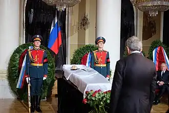 El cuerpo de Gorbachov yacía el 3 de septiembre en el Salón del Pilar de la Casa de los Sindicatos en Moscú, que históricamente se ha utilizado para celebrar funerales de estado para funcionarios y líderes de alto rango, incluido Joseph Stalin después de su muerte en 1953.[3][4] En particular, a diferencia de su sucesor, Boris Yeltsin, a Gorbachov no se le concedería un funeral de estado. Sin embargo, el portavoz del Kremlin, Dmitry Peskov, anunció que a Gorbachov se le darían "elementos de un funeral de estado", como una guardia de honor y una organización gubernamental parcial.[5] También se anunció que el presidente ruso, Vladímir Putin, no asistiría al funeral de Gorbachov, una medida que atrajo la atención de los medios.[6] Un comunicado del Kremlin alegó que esto se debió a su apretada agenda.[7][8]