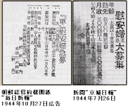 Los proveedores militares insertaron unas noticias. Un aviso que se publicó en el periódico coreano Gyeongseong Ilbo, decía que las mujeres recibirían sus sueldos y deberían tener más de 18 años. Hubo encargados en Seúl para la autoridad japonesa y ambos, militares y civiles participaron. Después de la segunda guerra sino-japonesa, las noticias se propalaron a lo largo de medios de comunicación en los territorios ocupados.