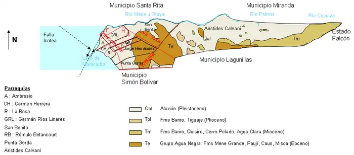 La ciudad de Cabimas al oeste del municipio, se encuentra sobre sedimentos no consolidados de edad Holoceno. Hacia la carretera Lara–Zulia, hay afloramientos de edad Eoceno Fm. Misoa, siendo el principal de estos el cerro La Antena (llamado así por una antena repetidora de señales de radio), hacia el este afloran formaciones más recientes, de edad Plioceno y Mioceno, estas últimas al este de la parroquia Arístides Calvani corresponden a la cuenca de Falcón. Las formaciones eocenas constituyen un paleoalto, el cual fue erosionado hasta su base expuesta, el extremo oriental es alóctono posicionándose durante el Eoceno, y formando una cuenca interior.