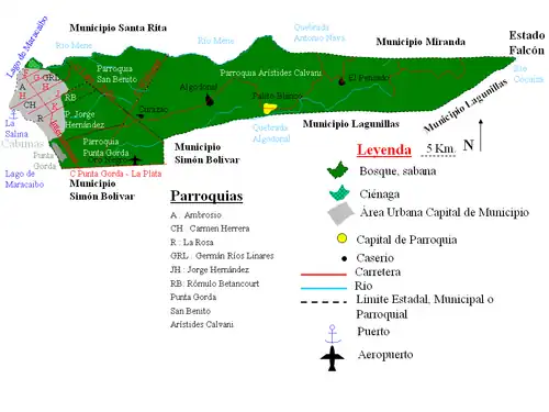 La ciudad de Cabimas ocupa todas las parroquias con excepción de Arístides Calvani que es el área rural y Punta Gorda ocupada por el pueblo de Punta Gorda.