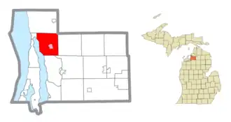 ![]() A la izquierda, ubicación entre las subdivisiones administrativas del condado de Antrim. A la derecha, ubicación del condado de Antrim en el estado de Michigan