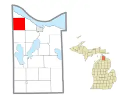 ![]() A la izquierda, ubicación entre las subdvisiones administrativas del condado de Cheboygan. A la derecha, ubicación del condado de Cheboygan en Míchigan