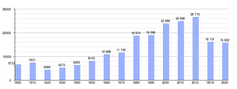 Fuente ISTAT elaboración gráfica de Wikipedia. -*2019 Estimación. Es el año en el que se reconoció oficialmente la municipalizan de la comunidad de Coatetelco dejando así de ser parte de la municipalidad de Miacatlán.- |