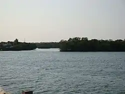 Cuerpo de agua con pequeñas islas de exuberante vegetación de manglar y palmeras, hábitat de infinidad de aves acuáticas como garzas, gaviotas y pelícanos, entre otros. En contraste con la naturaleza sobresale el puente que une a la carretera Paraíso–Chiltepec.[14]