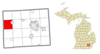 ![]() A la izquierda, ubicación entre las subdivisiones administrativas del condado de Washtenaw. A la derecha, ubicación del condado de Washtenaw en el estado de Michigan