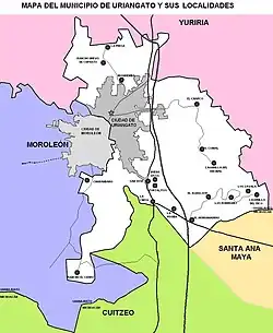 Uriangato (cabecera municipal), El Aguacate, Buenavista, El Cerro, La Cinta, El Comal, El Charco, El Derramadero, Huahuemba, Lagunilla del Encinal, Lagunilla del Rico, La Peonia, Los Portalitos, La Presa (Presa de Huahuemba), Rancho Nuevo de Cupuato, Los Rodríguez, San José Cuaracurio, Los Zavala, Charándaro, Colonia Juárez, La Mesa, Cabañas, Predio la Lomita, Potrero de los Andrade, La Peonia Residencial Campestre, El Kilómetro Uno, Rancho Alegre, Granja los Ángeles, El Mirador, Las Misiones, Colonia el Mirador, Las Cabañas del Pedregal, El Huanumo, Colonia Magisterial, Bugambilia, Nuevo Uriangato, Peñón del Divisadero, Jara Brava, La Presa del Conejo, Club Campestre Moroleón, El Pretil, Españita, Pioneros, Quinta Loma, La Querencia, [28]