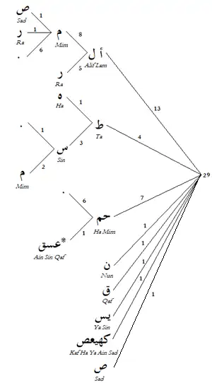 Hay 14 combinaciones únicas; las más frecuentes son ʾAlif Lām Mīm y Ḥāʾ Mīm, que ocurren seis veces cada una. De las 28 letras del alifato, la mitad aparece como muqatta'at, ya sea individualmente o en combinaciones de dos, tres, cuatro o cinco letras. Las catorce letras son: ʾalif أ, hā هـ, ḥā ح, ṭā ط, yā ي, kāf ك, lām ل, mīm م, nūn ن, sīn س, ʿain ع, ṣād ص, qāf ق, rā ر. Las seis letras finales de la orden abŷadi (thakhadh ḍaẓagh) no se utilizan. Las letras representadas corresponden a las letras escritas sin signos diacríticos , además de yāʿ ي.[3] Es posible que el conjunto de letras muqatta'at pretendiese invocar una variante arcaica del alfabeto árabe inspirado en el alfabeto arameo.[4]
