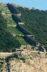 La parte alta de la muralla, algo más hacia el sur, escala la pendiente en zigzag a partir de la punta del acantilado hasta la cresta superior del peñón, una configuración que proporcionaba a los defensores de la colina la facilidad de devolver fuego de flanqueo mientras avanzaban a lo largo de la muralla.[4] La punta superior de la estructura se conoce como el Hacho, ya que allí había una torre que servía de faro improvisado. La torre ya no existe en la actualidad.