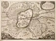 Las murallas que se conservan en la actualidad se completaron alrededor de 1400, constituyendo una estructura de cinco kilómetros en forma de un paralelogramo torcido, que contaba con una torre de entrada en cada uno de sus cuatro rincones. El conjunto defensivo constaba de la muralla exterior (llamada «muralla alta»), la muralla baja levantada desde el foso, el zwinger de 15 metros entre ambas murallas y el foso (más tarde ampliado). Se han podido identificar a partir de antiguas representaciones un total de unas 130 torres de muralla y torres de foso.[6]