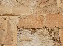 En el extremo izquierdo del muro, cerca de la Puerta Doble, hay incrustada una losa de mármol con una inscripción en latín, invertida verticalmente. Según investigaciones, se trata de un fragmento de la base de una estatua del emperador Antonino Pío (138-161) que estaba ubicada en el Templo de Júpiter —en la plataforma del Monte del Templo— construida por los romanos en Aelia Capitolina. El Itinerarium Burdigalense de 333 menciona dos estatuas del emperador Adriano, y se cree que la segunda estaba dedicada a su sucesor, Antonino Pío, bajo cuyo reinado continuó la construcción de Aelia Capitolina. Lo más probable es que los obreros omeyas que trabajaron en la reconstrucción del muro utilizaran el fragmento junto a otras piedras como «parche», sin prestar atención al detalle de la dirección del texto en la inscripción.[17]​ La inscripción, en la que se usan las abreviaturas habituales de la época, reza:[18]