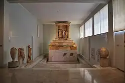 • Otra sección está dedicada a la evolución de las estelas funerarias. En ella destacan las piezas pertenecientes a los siglos V y IV a. C. que se hallaban a lo largo del camino de los Muros Largos que discurría entre Atenas y El Pireo. A esta sección pertenece también el gran monumento funerario de Kallithea, del siglo IV a. C. y un león funerario hallado en Mosjato.