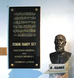 Placa y busto de Osman Hamdi Bey ubicado en el edificio principal del museo.