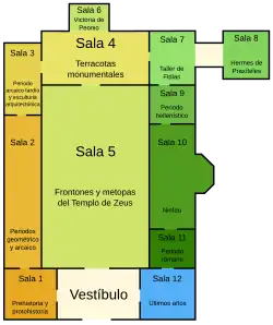 - ↑ a b c d e f g h i j k l Vikatou, Olympia. «Permanent exhibition of the Olympia Archaeological Museum. Archaeological Museum of Olympia». Ministry of Culture and Sports (en inglés). Consultado el 13 de diciembre de 2018.