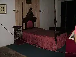DORMITORIO Domina el recinto una cama que perteneció a Fernando de la Mora, cuya imagen se puede apreciar en la pared derecha de la habitación, debajo de la misma, una camisa bordada, que también perteneció al prócer.