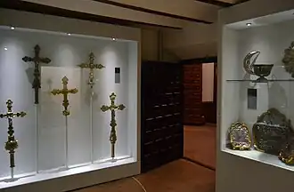 - 2. Colección de orfebrería, custodias y cálices de distintas épocas, principalmente de los siglos XVI y XVII; De esta sala, que corresponde a la antigua biblioteca, destaca la cruz procesional de Noguera.
