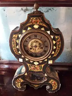 También en su interior, existen muebles de origen europeo: como una consola, una cómoda, un sillón y un reloj francés decorado con incrustaciones de madre perla y dibujos florales.