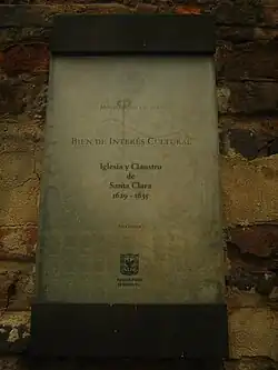 Letrero a la entrada de la construcción nombrando la iglesia como "Bien de interés cultural" por el Ministerio de las Culturas, las Artes y los Saberes. Cabe destacar ante esto su nombramiento como patrimonio de la humanidad por la UNESCO en 1971.