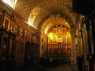 Junto al coro y arco toral, representa el foco de mayor esplendor dentro de la iglesia. Construido hacia la mitad del siglo XVII, consta de tres cuerpos y cinco calles, tallados y dorados íntegramente en hojilla de oro, costeado en su totalidad por doña María Arias de Ugarte, según documentos históricos le costó a ella el valor de 4200 pesos de a 8 escudos. Las hornacinas exhiben figuras talladas en madera, varias con trajes elaborados en tela encolada y decorados ricamente con las técnicas del estofado y el esgrafiado.