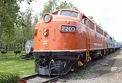 | SBC 2203 | Locomotora Diésel Eléctrica EMD FT | Construida por Electro Motive Division en 1944 para el ferrocarril Northern Pacific con su unidad B, esta es una máquina muy especial ya que es el primer modelo de la exitosa serie F de EMD, fue vendida al Ferrocarril Sonora Baja California y operó hasta la unificación de Ferrocarriles Nacionales de México, tras esto fue rescatada en los talleres de empalme donde fue separada de su unidad B que nunca fue rescatada y fue modificada para operar con regularidad. Ingresó al Museo Nacional de Ferrocarriles Mexicanos en 1981 en un viaje desde Buenavista a Puebla.[27][28][29] Hoy en día se utiliza para movimientos en el patio del museo.[18] | ![]() |
