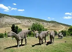 ![]() Vista del frente acristalado del museo, con recreaciones de titanosaurios. | ||