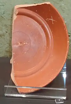 Fragmento de un plato de terra sigillata hispánica (TSH Drag. 15/17), con la inscripción «[ex] of val pat» (‘del taller de Valerius Paternus’), hallado en la villa romana de Paterna.