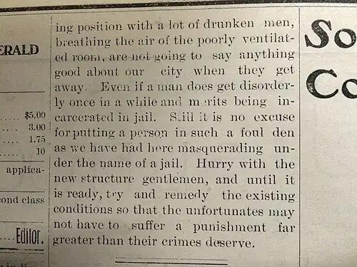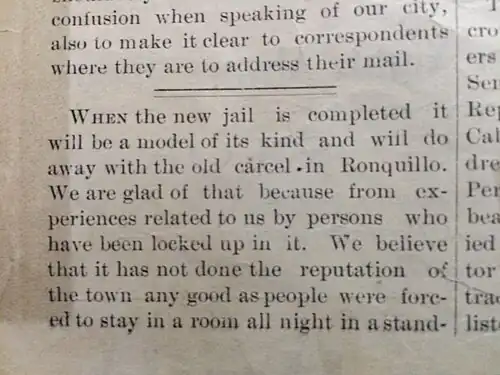 Cuando la nueva cárcel esté concluida, será un modelo en su género y va acabar con la “carcelita” del Ronquillo. Estamos contentos con esa noticia porque las experiencias relacionadas con personas que han sido encerradas en ella, no han sido justas. Creemos que la reputación de algunas buenas personas que fueron recluidas allí ha sido afectada ya que estuvieron en esa habitación toda la noche en una posición de pie con un montón de hombres borrachos, respirando el aire de es lugar mal ventilado. Es una pena pues no van a decir nada bueno acerca nuestro pueblo cuando se vayan a su ciudad. Aunque un hombre pierda el control de vez en cuando sus principios quedarán anulados al ser recluido dentro de una cárcel. No es excusa encerrar a una persona por un delito menor, pues no deben sufrir un castigo más grande que su falta.