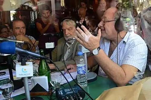 En el programa de radio Gente de a pie, Néstor Restivo y Mario Wainfeld (1948-) con el historiador Osvaldo Bayer (1927-2018) en un bar de avenida Directorio (Buenos Aires), 13 de abril de 2013.