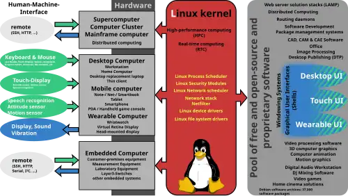 Linux se despliega en una amplia variedad de sistemas informáticos, como sistemas embebidos, dispositivos móviles (incluido su uso en el sistema operativo Android), computadoras personales, servidores, mainframes y supercomputadoras.[6][7]