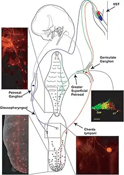 Las células gustativas hacen sinapsis con los axones sensoriales primarios de tres nervios craneales: el nervio facial, el nervio glosofaríngeo y el nervio vago. Estos nervios craneales inervan las papilas gustativas de la lengua, el paladar, la epiglotis y el esófago. Las neuronas sensoriales primarias de estos axones centrales se encuentran en los ganglios craneales de cada nervio craneal respectivo. Para producir el sentido del gusto, estas neuronas se proyectan al núcleo gustativo o a las regiones rostral y lateral del núcleo del tracto solitario y, en última instancia, se proyectan a la corteza cerebral.[3]