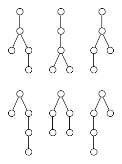 (). De manera análoga, podemos construir una palabra Dyck a partir de un árbol enraizado mediante una búsqueda en profundidad. Por tanto, existe un isomorfismo entre las palabras de Dyck y los árboles enraizados.