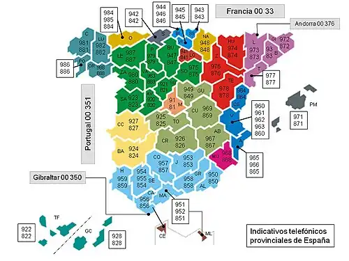 En España, los números telefónicos de la red fija nacional están formados por nueve dígitos y empiezan por 9 u 8, siguiendo el formato 9AX XY WZ AB o 8AX XY WZ AB (desde fuera de España : +34 9AX XY WZ AB o +34 8AX XY WZ AB), siendo el primer A una cifra distinta de 0 o de 9. Los números que comienzan por 90 y 80 no son números geográficos, sino números de tarifas especiales, que pueden ir desde números gratuitos (900 y 800), hasta números con coste adicional (80X). Los números que comienzan por 5 y algunos que empiezan por 8, son utilizados como números nómadas o virtuales (telefonía IP), siendo la libertad de localización plena para los que empiezan por 5 (sin vinculación geográfica) y vinculados a una provincia para los que empiezan por 8.[3][4] Algunos municipios fronterizos pueden tener el prefijo de la provincia limítrofe.