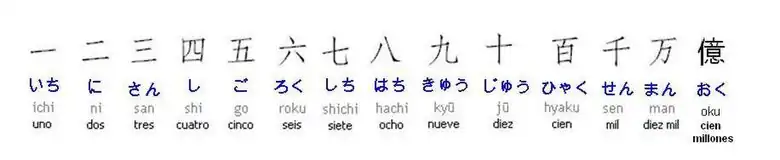 | Común | 一 | 二 | 三 | 四 | 五 | 六 | 七 | 八 | 九 | 十 | 二十 | 百 | 千 | 万 |