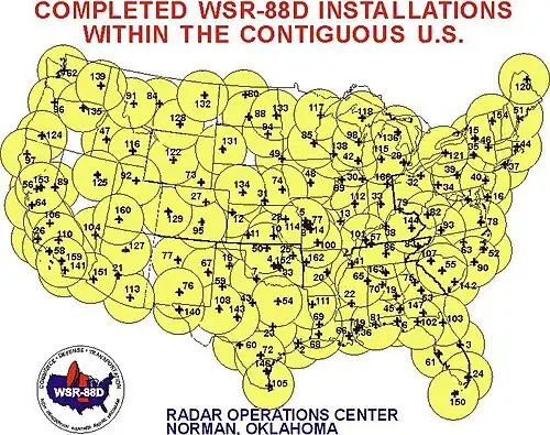 Después de más de 30 años de investigaciones en sistemas de radares meteo Doppler, el Servicio Nacional del Tiempo (NWS) comenzó a desplegar el WSR-88D en 1988. Vino a reemplazar al WSR-74 y al WSR-57 de 1974 y 1957 respectivamente. La primera instalación se completó en el verano de 1990 en Norman, Oklahoma, sin embargo, la primera instalación de un WSR-88D para su uso cotidiano en pronósticos fue en Sterling, Virginia el 12 de junio de 1992 (33 años). El último en instalarse fue en North Webster, Indiana el 30 de agosto de 1997. Las localidades se eligieron estratégicamente para proveer cobertura superpuesta entre radares en caso de fallo durante un severo evento climático. De ser posible, éstos se ubicaban adyacentes a las Oficinas de Pronósticos NWS para permitir un rápido acceso a los técnicos de mantenimiento.[1]