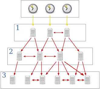 NTP tiene una estructura jerárquica por niveles, cada uno de estos niveles recibe el nombre de estrato. Estos niveles determinan la distancia desde el reloj de referencia.